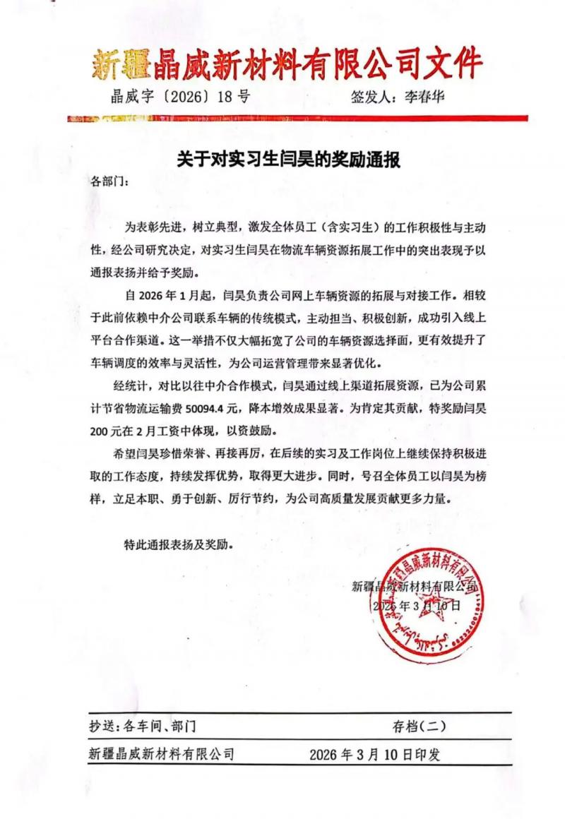 近日,我院食品化工系应用化工技术专业实习生闫昊在新疆晶威新材料有限公司实习期间,凭借物流车辆资源拓展
