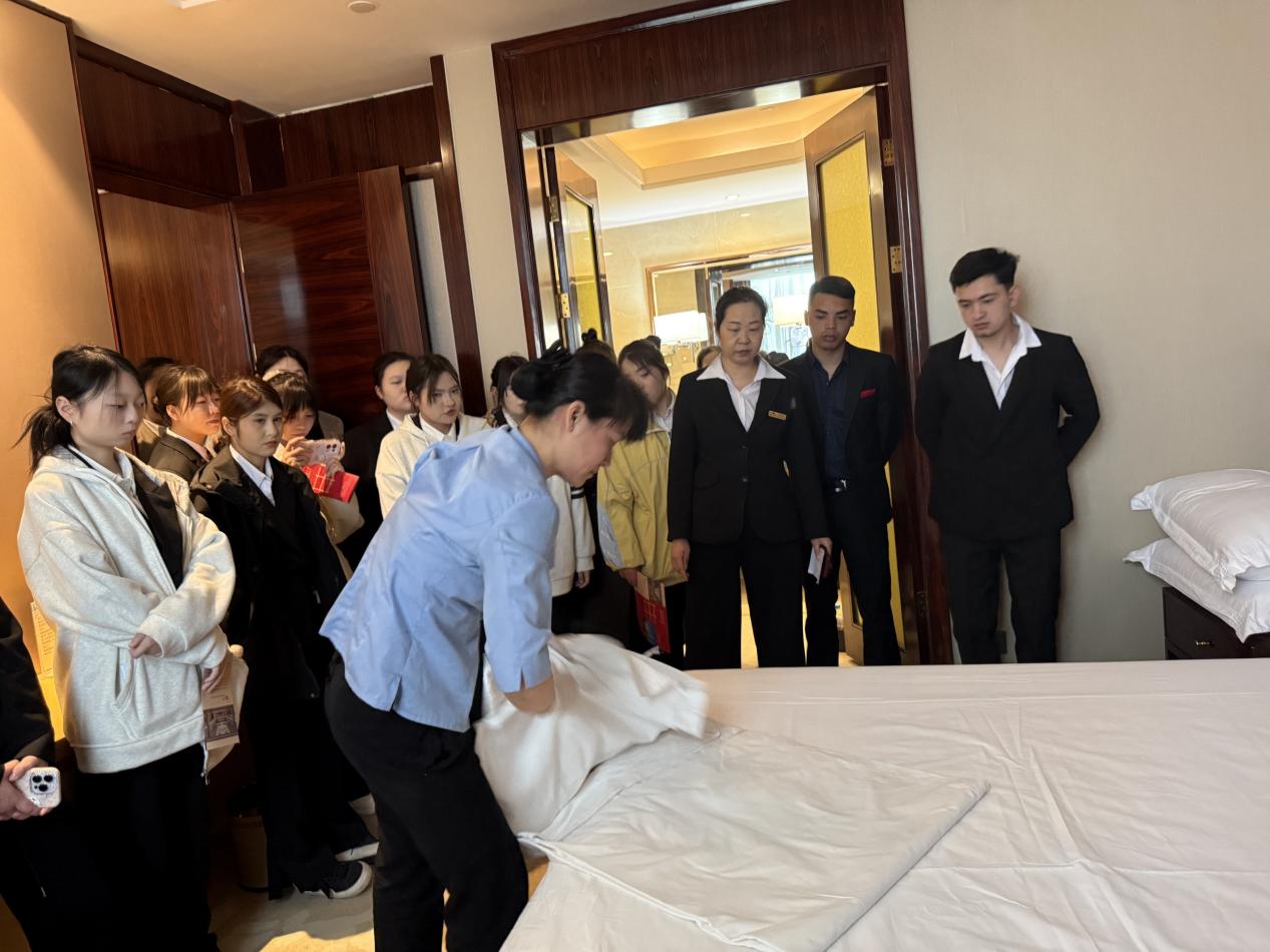 “一张床铺得好不好,客人躺下的第一秒就能感受到。”员工一边操作一边分享自己入行十余年的心得,“铺床不仅是体力活,更是技术活、良心活。”同学们屏息观看,掌声不断。