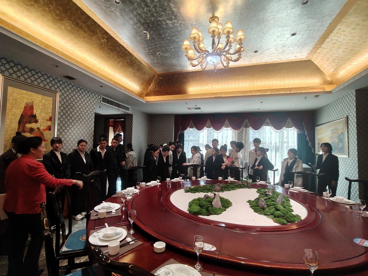 第二站,同学们来到餐饮部。餐饮部经理带领大家参观中餐厅包间、宴会厅及西餐厅,现场讲解中餐宴会摆台的标准规范:骨碟距离桌边1.5厘米,味碟与汤碗间距精准,筷架酒杯摆放对称……每一处细节都有严格标准。同学们边听边记,还在指导下尝试了简易摆台操作,亲身感受餐饮服务的艺术性。